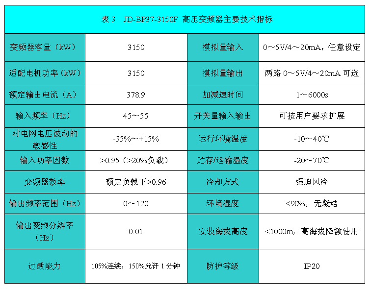 JD-BP37-3150F高壓變頻器技術(shù)指標(biāo)如表3所示。