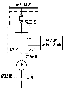 高溫風(fēng)機(jī)原配置帶星點(diǎn)柜配置液阻啟動(dòng)柜,本次改造保留原有星點(diǎn)柜和液阻柜保持不變。需要將星點(diǎn)柜斷路器的一組常開點(diǎn)引至變頻器。需要變頻拖動(dòng)電機(jī)時(shí),液阻柜按原控制方式啟動(dòng)。即上級(jí)高壓開關(guān)柜給變頻器送電后,液阻柜得到開關(guān)柜閉合狀態(tài)信號(hào)后就啟動(dòng)。星點(diǎn)柜閉合后,變頻器檢測到閉合信號(hào)后方具備開機(jī)條件,然后根據(jù)實(shí)際情況給變頻器啟動(dòng)信號(hào),變頻投入運(yùn)行。工頻運(yùn)行時(shí),閉合K3,斷開K1,K2,液阻柜按原先工頻方式啟動(dòng),完成星點(diǎn)柜和液阻柜的啟動(dòng),達(dá)到電機(jī)軟啟動(dòng)。