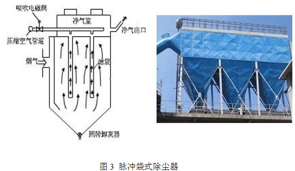 ?。?)脈沖袋式除塵器,如圖3所示,含塵氣體從袋式除塵器進(jìn)口引入后,通過(guò)煙氣分配裝置均勻進(jìn)入濾袋,在此過(guò)程中粉塵即被濾袋的外側(cè)所阻擋,經(jīng)過(guò)凈化處理的氣體從出口排出,當(dāng)濾袋表面的粉塵不斷增加到一定的厚度,導(dǎo)致設(shè)備阻力上升到設(shè)定值時(shí),微壓差控制信號(hào)有信號(hào)輸出。控制儀發(fā)出信號(hào),使噴吹系統(tǒng)工作,電磁脈沖閥打開,此時(shí)壓縮空氣從氣包順序經(jīng)脈沖閥和噴嘴向?yàn)V袋內(nèi)噴射,附于袋外的粉塵脫離濾袋落入灰斗,然后由回轉(zhuǎn)排灰閥將粉塵排出。