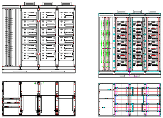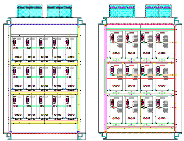 隨著高壓變頻器市場(chǎng)規(guī)模的不斷擴(kuò)大,用戶對(duì)變頻的苛求也越來(lái)越嚴(yán)格。作為產(chǎn)品開(kāi)發(fā)商,也不斷為提升產(chǎn)品質(zhì)量與檔次作著不懈努力,所用柜體也由原來(lái)的單一種類向更寬范方向發(fā)展,其產(chǎn)品功能、質(zhì)量與外形都在不斷升級(jí)。同規(guī)格變頻器原體積如圖(4)。其單元結(jié)構(gòu)排布也有了更新的認(rèn)知,由于原來(lái)每相豎排所用電纜多、結(jié)構(gòu)復(fù)雜、附加成本大,便改為每相單元橫排,使變壓器次級(jí)引線分別對(duì)應(yīng)A、B、C三相,不再有接線柜,直接通過(guò)電纜托板到達(dá)各單元,不再迂回,其控制柜也由原來(lái)的600mm轉(zhuǎn)為400mm。另一個(gè)飛躍則是每相單元數(shù)量的減少,如10kV改為8單元/相,6kV改為5單元/相。功率單元數(shù)量少了,其整機(jī)質(zhì)量并沒(méi)有受到影響,相反其故障點(diǎn)卻相應(yīng)減少,加之電路結(jié)構(gòu)上星點(diǎn)漂移技術(shù)的應(yīng)用,使得變頻器性能更加優(yōu)越。功率柜具體排布情況,6kV5個(gè)單元,每相橫向分布,上、中、下三相如圖(5)所示。10kV如果采取單元前后放置,每相前4后4,如圖(6)所示: