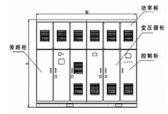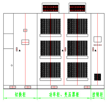 設(shè)計(jì)之初,為保證產(chǎn)品的可靠性、穩(wěn)定性,采用雙重冗余設(shè)計(jì)的模式,即加大了單元的數(shù)量,也增大了各器件的選型。10kV采用每相10個(gè)單元或13個(gè)單元,6kV采用每相6個(gè)單元或8個(gè)單元;功率器件選型余量大至2.5倍甚至3倍,電解電容選擇90-120UF/A,變壓器鐵芯、風(fēng)機(jī)風(fēng)量選型都不同程度的大一規(guī)格。其排布則延續(xù)傳統(tǒng)的排布模式,即從左往右依次為切換柜、變壓器柜、(接線柜)、功率柜、控制柜的模式,其外形如圖(1):