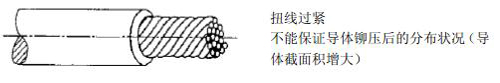 (1)捻頭過(guò)緊即捻頭角度過(guò)大,可使線芯脫出或斷掉,且會(huì)使壓接后的附著力減小,影響壓接可靠性,如圖4所示;