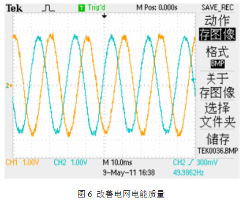 響應(yīng)速度小于5ms,對(duì)于電網(wǎng)電壓的跌落和閃變具有一定抑制作用并網(wǎng)波形(如圖6所示):
