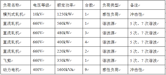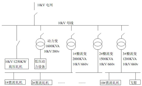現(xiàn)場主要負(fù)荷是1臺1250kW/10kV橫列式軋鋼機(jī)和數(shù)臺不同功率等級的低壓直流軋機(jī),以及生產(chǎn)線上運(yùn)動部件的低壓交流驅(qū)動電機(jī)。